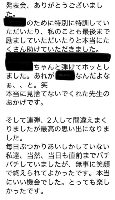 Mちゃん!今後もどんなに大変な時でも、音楽(ピアノ)を心の友として過ごしていってくださいね😊